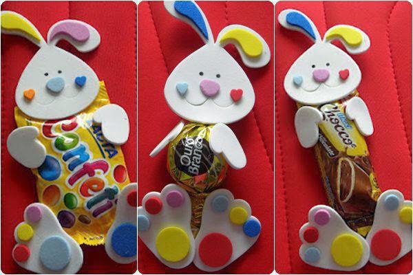 EVA coloridos e chocolate e você fará esse lindo coelho com corpinho de chocolate, imagem aqui.